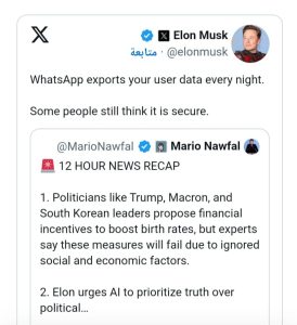 اتهم الملياردير إيلون ماسك تطبيق “واتساب” بنقل بيانات المستخدمين الخاصة بانتظام خلال الليل.