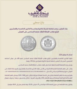 واضاف البلاغ ،أنه كتب على ظهر القطعة النقدية عبارة ” الذكرى الخامسة والعشرين لتولي صاحب الجلالة العرش”.