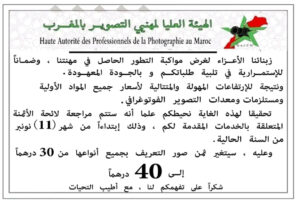 قررت الهيئة العليا لمهنيي التصوير بالمغرب رفع أسعار خدمات صور التعريف المقدمة للمواطنين، حيث ارتفع السعر من 30 درهمًا إلى 40 درهمًا.