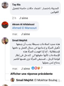 من جانبها، وصفت منسقة ائتلاف دنيا (شبكة نسائية) أمال الأمين الجدل القائم حول مدونة الأسرة بالظاهرة الصحية والضرورية، والتي تعكس حيوية المجتمع وحرصه على تطوير منظومته القانونية بما يتماشى مع التحولات الاجتماعية والاقتصادية والثقافية