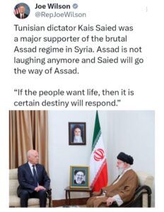 وفي تصعيد غير مسبوق، نشر ويلسون صورة لقيس سعيد مع المرشد الإيراني علي خامنئي، متسائلًا: