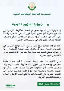 اعتبرت الخارجية الجزائرية في بلاغ لها،سريع سبق حتى بلاغ صنيعتها البوليساريو:’ أن زيارة الوفد الفرنسي ( لم تسميه ) تستدعي الشجب والادانة”، مشيرة إلى أن الزيارة استخفاف ( بحسبها ) بالشرعية الدولية.