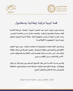أكدت حكومة الوحدة الوطنية الليبية أن اللقاء الذي من المقرر أن يجمع اليوم الجمعة باسطنبول الرئيس التركي رجب طيب أردوغان، ورئيسة الوزراء الإيطالية جورجيا ميلوني، وعبد الحميد الدبيبة رئيس حكومة الوحدة الوطنية، سيتناول ملفات “استراتيجية” منها الشراكة في مجال النفط والطاقة وتداعيات الهجرة غير النظامية.
