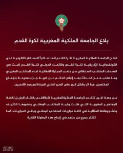 أعلنت الجامعة الملكية المغربية لكرة القدم، اليوم الاثنين، أنها ستلجأ للمساطر القانونية لدى الكونفدرالية الإفريقية لكرة القدم (كاف) والاتحاد الدولي لكرة القدم (فيفا) “للبت في انسحاب المنتخب السنغالي من ملعب المباراة النهائية أمام المنتخب المغربي.