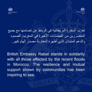 أعربت السفارة البريطانية في الرباط عن تضامنها مع جميع المتضررين من الفيضانات الأخيرة في المغرب. واعتبر منشور لموقع السفارة على مواقع التواصل الاجتماعي ،أن الصمود والدعم المتبادل الذي أظهره المغاربة مصدر إلهام كبير. يمكنكم مشاركة المقال على منصتكم المفضلة