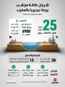 اتفاق حكومي بين 13 دولة معنية بمشروع أنبوب الغاز نيجيريا المغرب سيوقع هذا العام بكلفة 25 مليار دولار أي ما يعادل 23.000 مليار سنتيم، وفق مديرة المكتب الوطني للهيدروكربورات والمعادن. يمكنكم مشاركة المقال على منصتكم المفضلة
